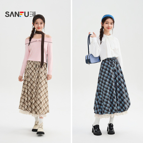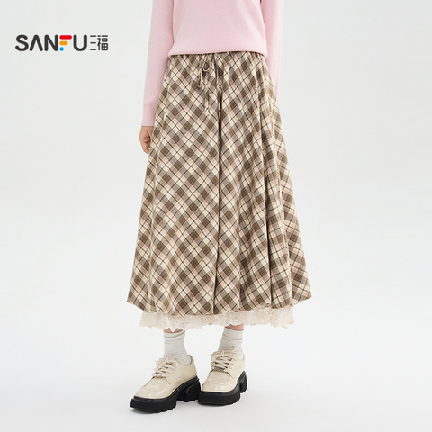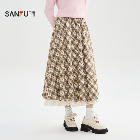 三福半身裙2025新款冬季巨好看的蕾丝拼接复古格子裙子女装509019