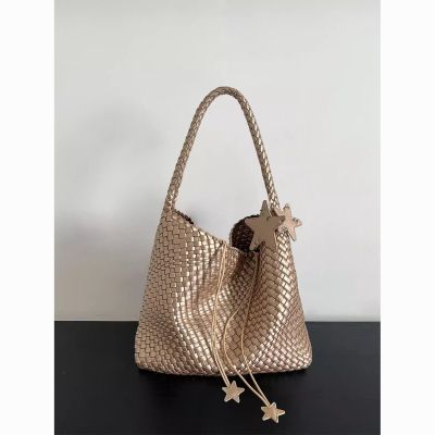 枪枪同款香槟色编织托特包女2025新款大容量通勤包腋下单肩水桶包