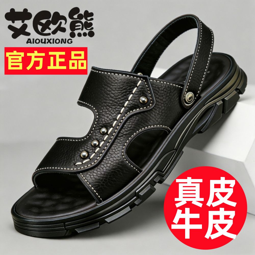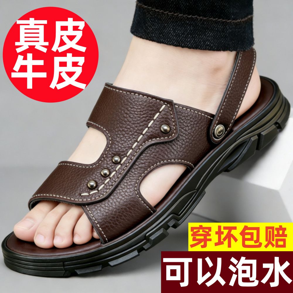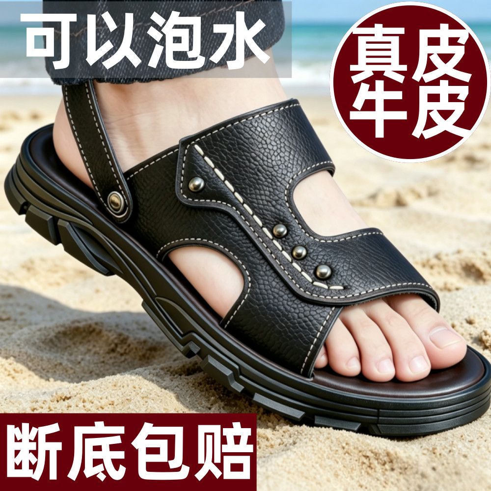 新款100%真皮牛皮男士凉鞋耐磨防滑沙滩鞋防水透气凉拖两用开车鞋