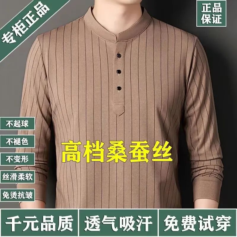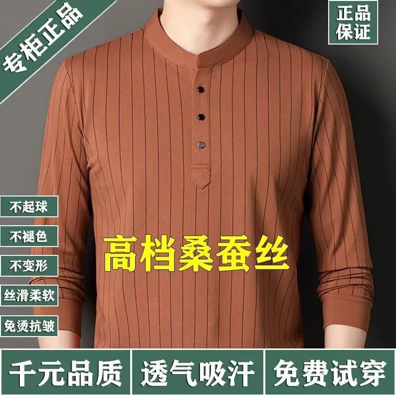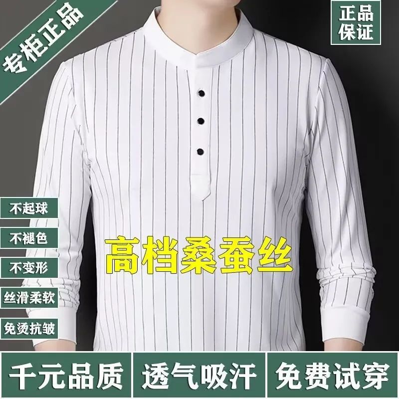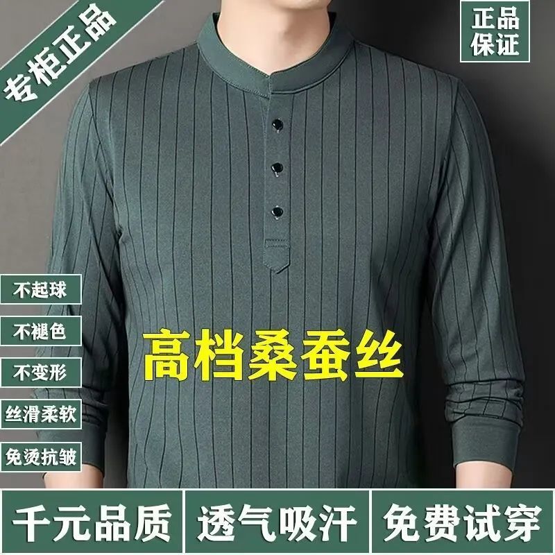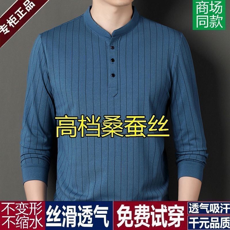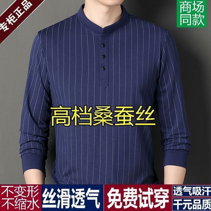 正品桑蚕丝长袖t恤男士春秋新款立领条纹时尚打底衫中年百搭上衣