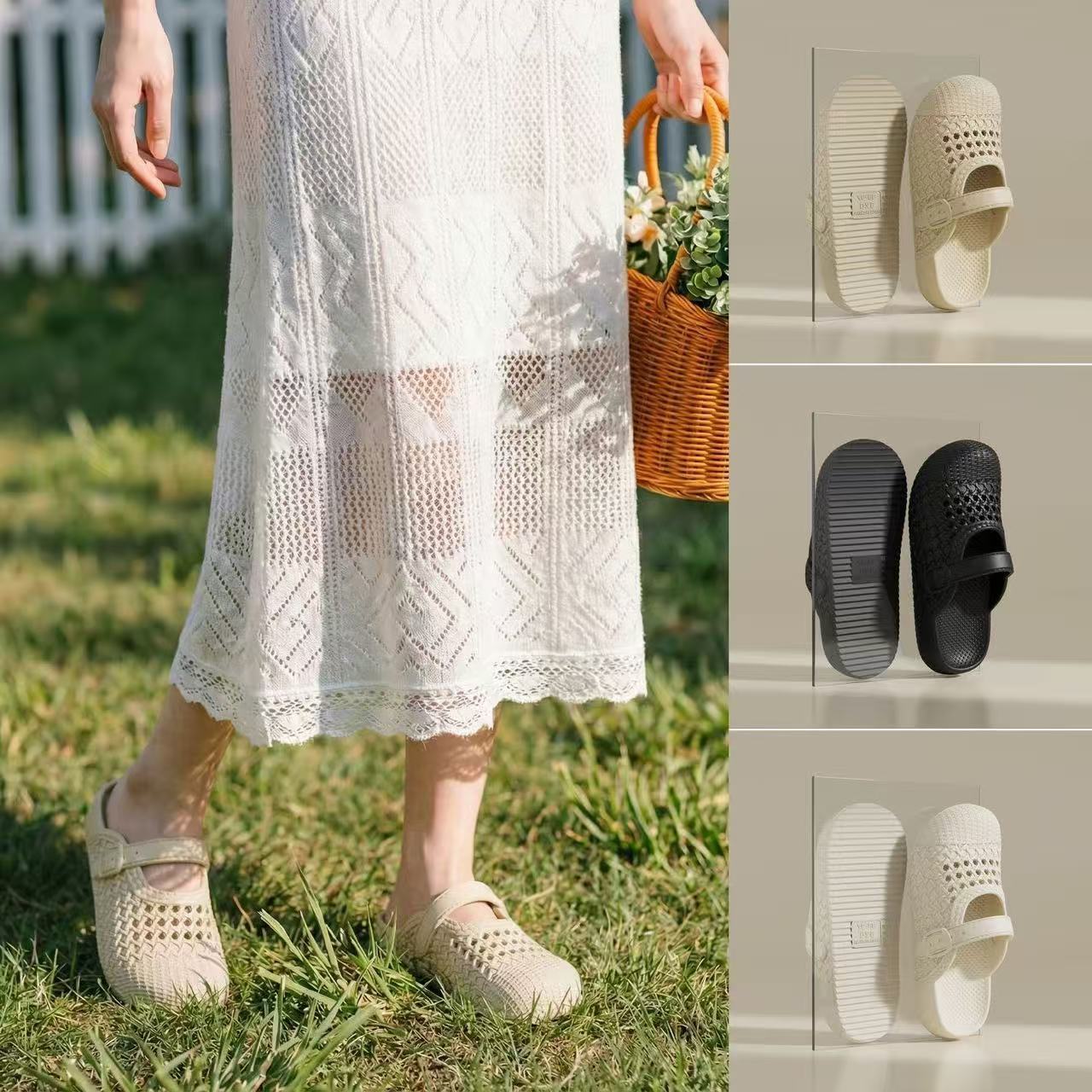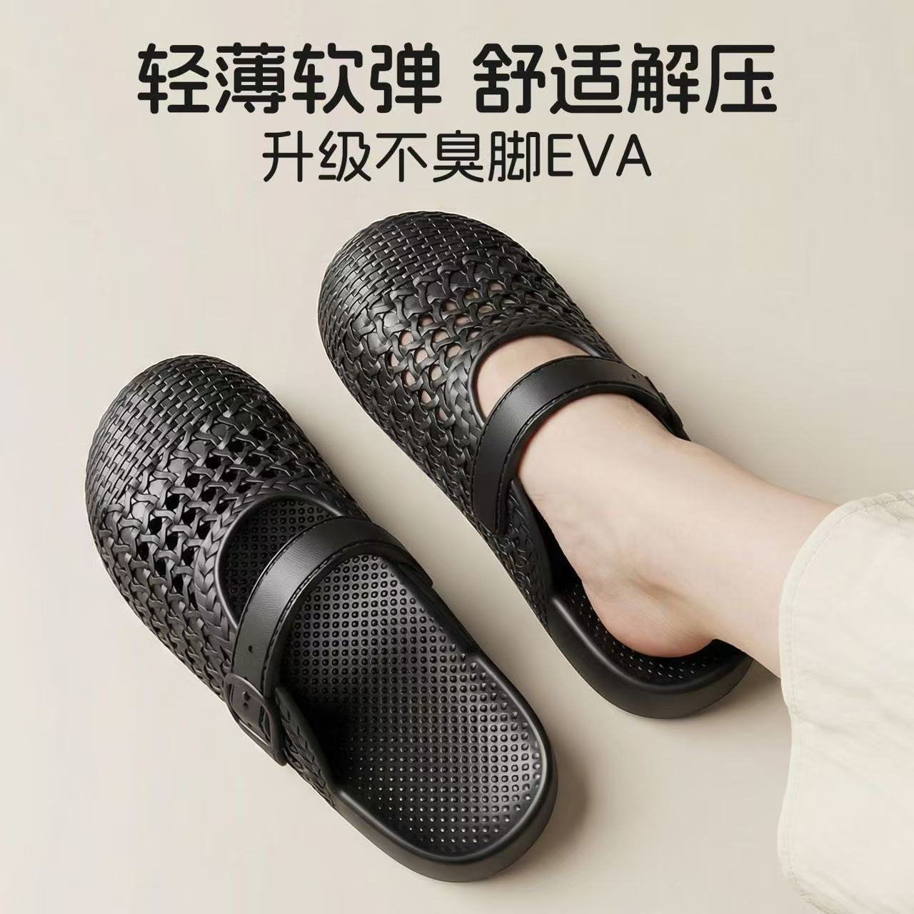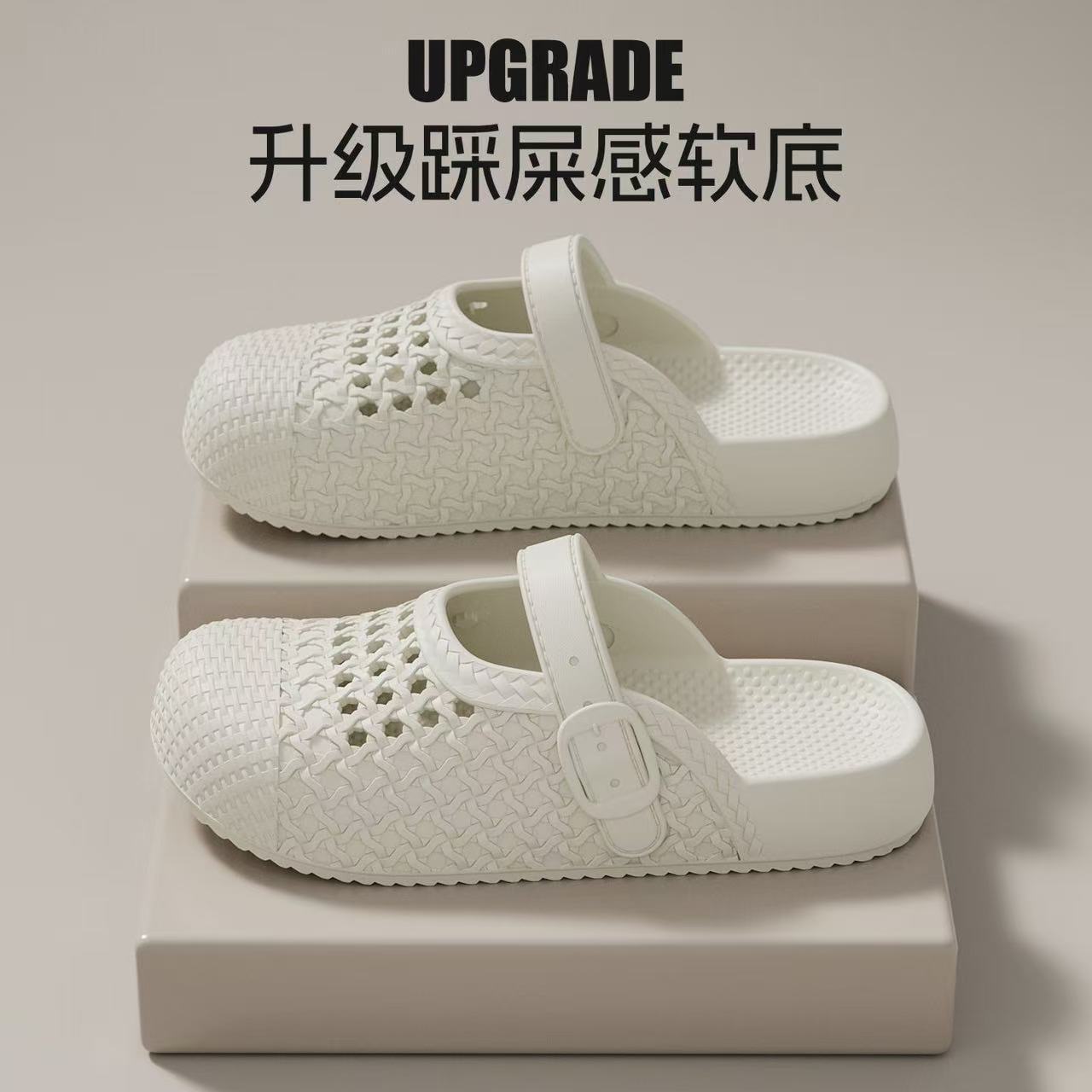 2026夏季新款百搭复古厚底包头半拖鞋女勃肯鞋编织镂空休闲凉拖鞋