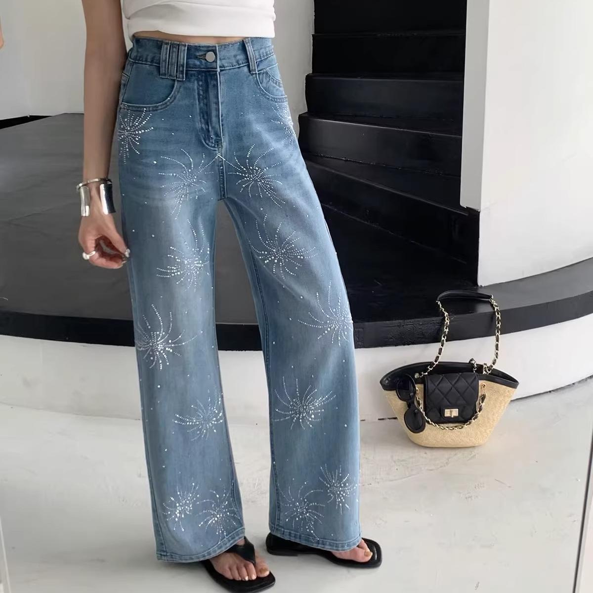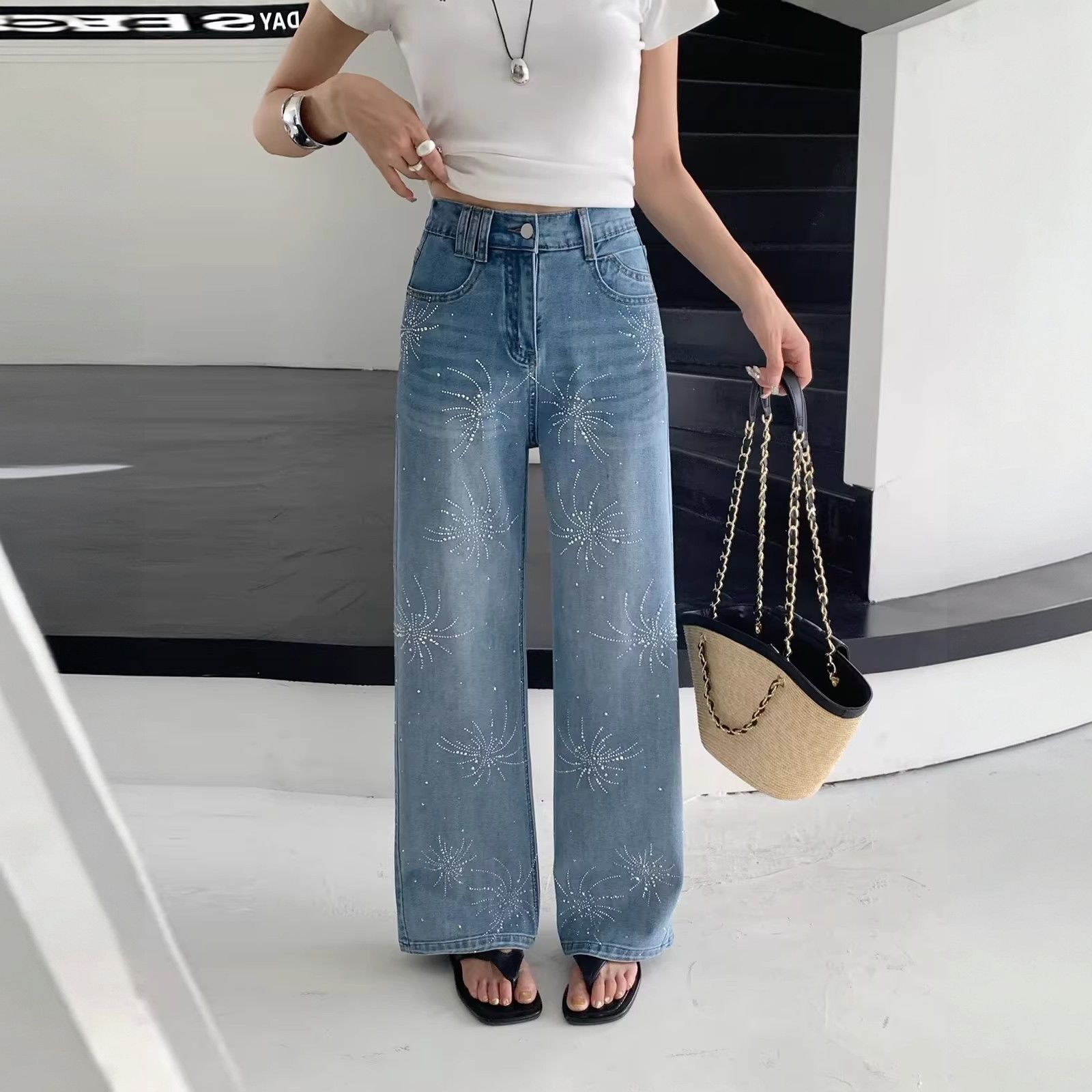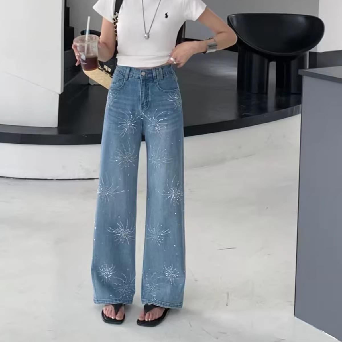 大码胖MM重工烫钻烟花直筒牛仔裤女春季2026年新款显瘦窄版阔腿裤