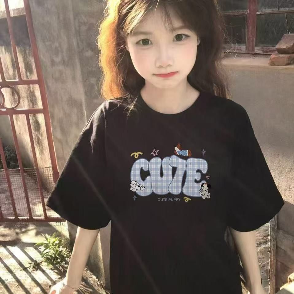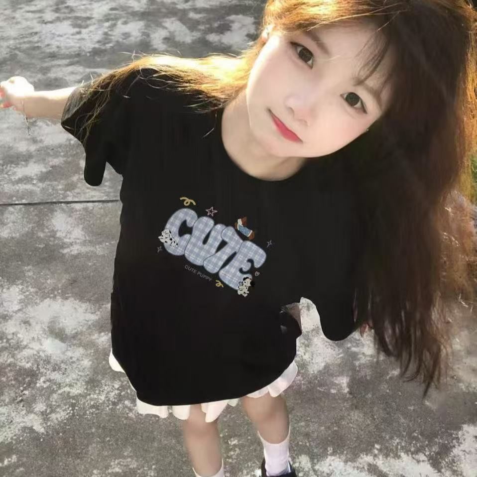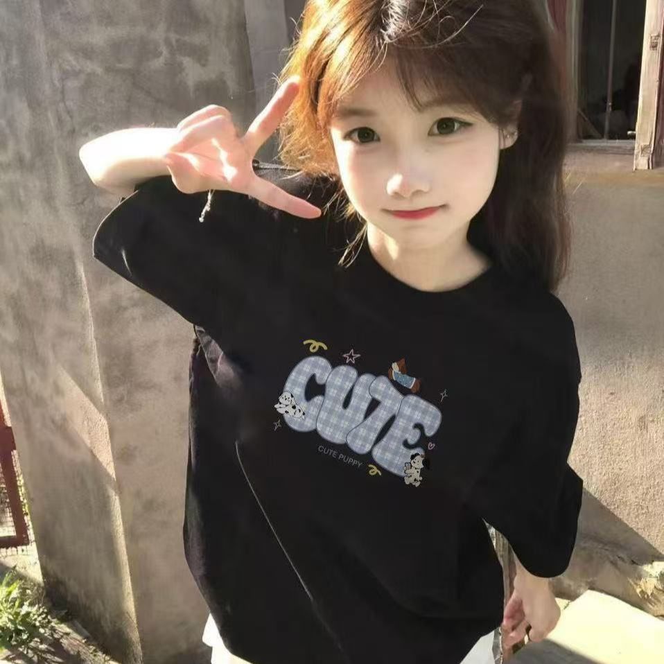 100%纯棉韩版设计感小众短袖t恤女ins新款格子字母印花百搭上衣夏