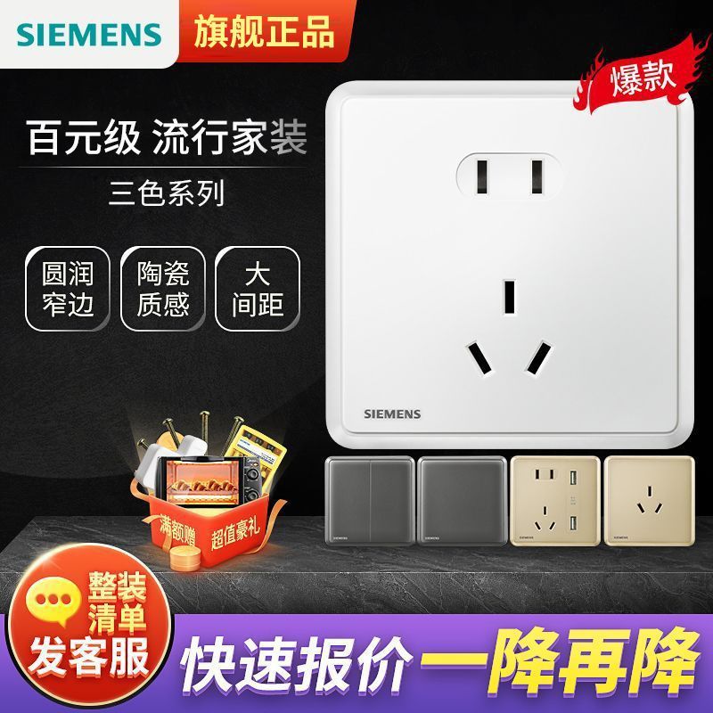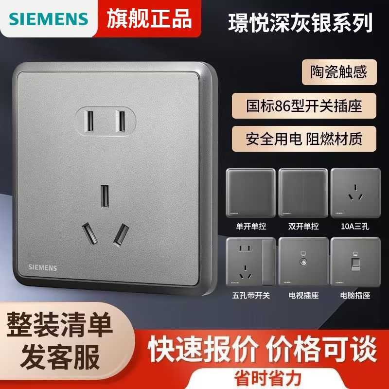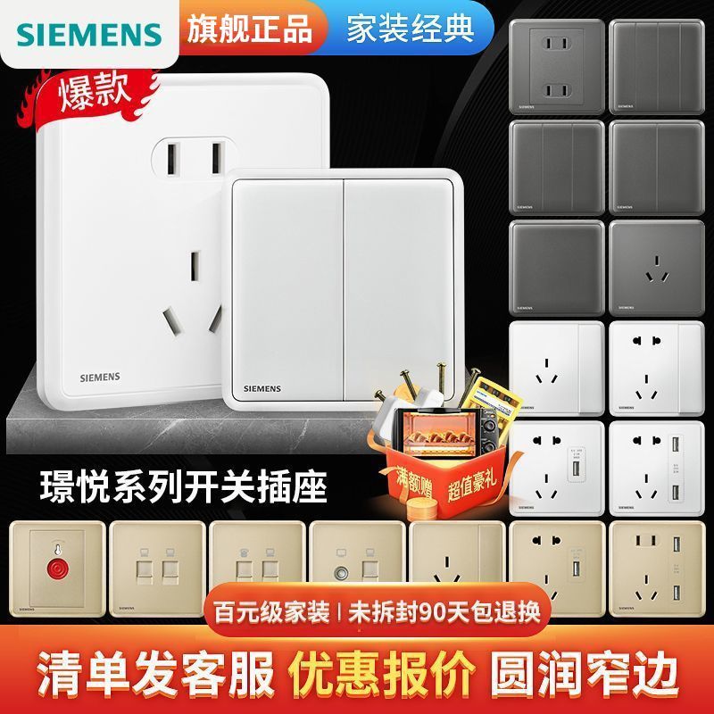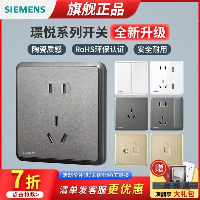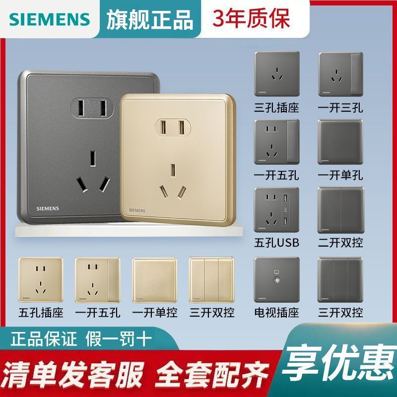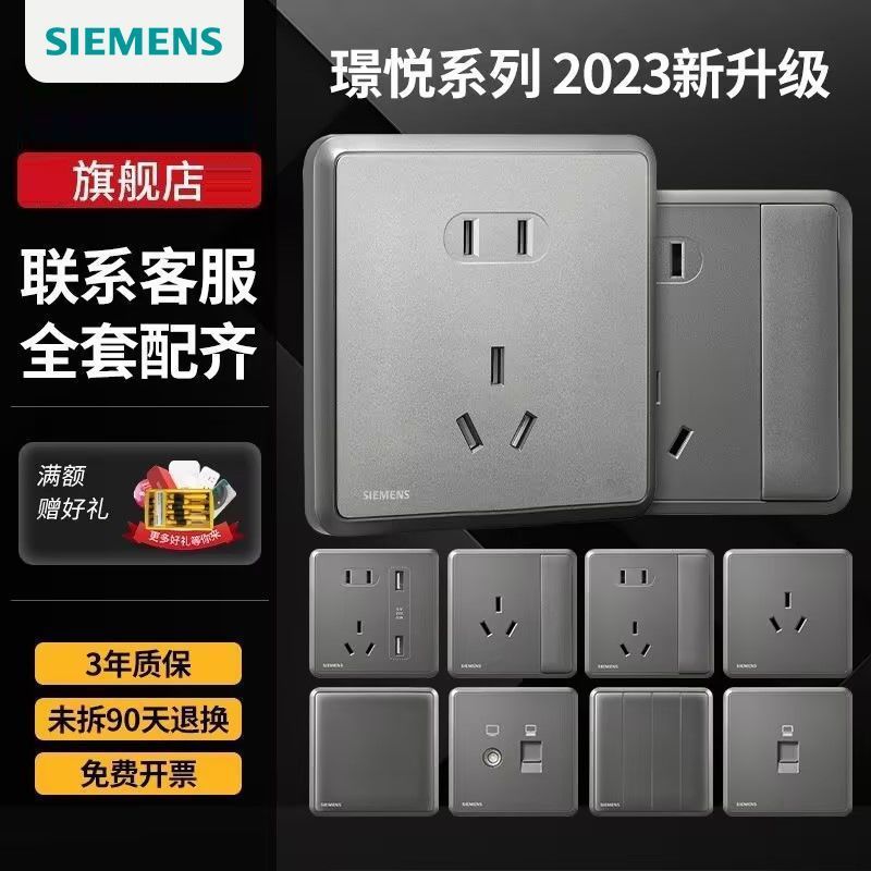 西门子开关插座面板璟悦白灰金家用86型单开双控开关一开五孔套装