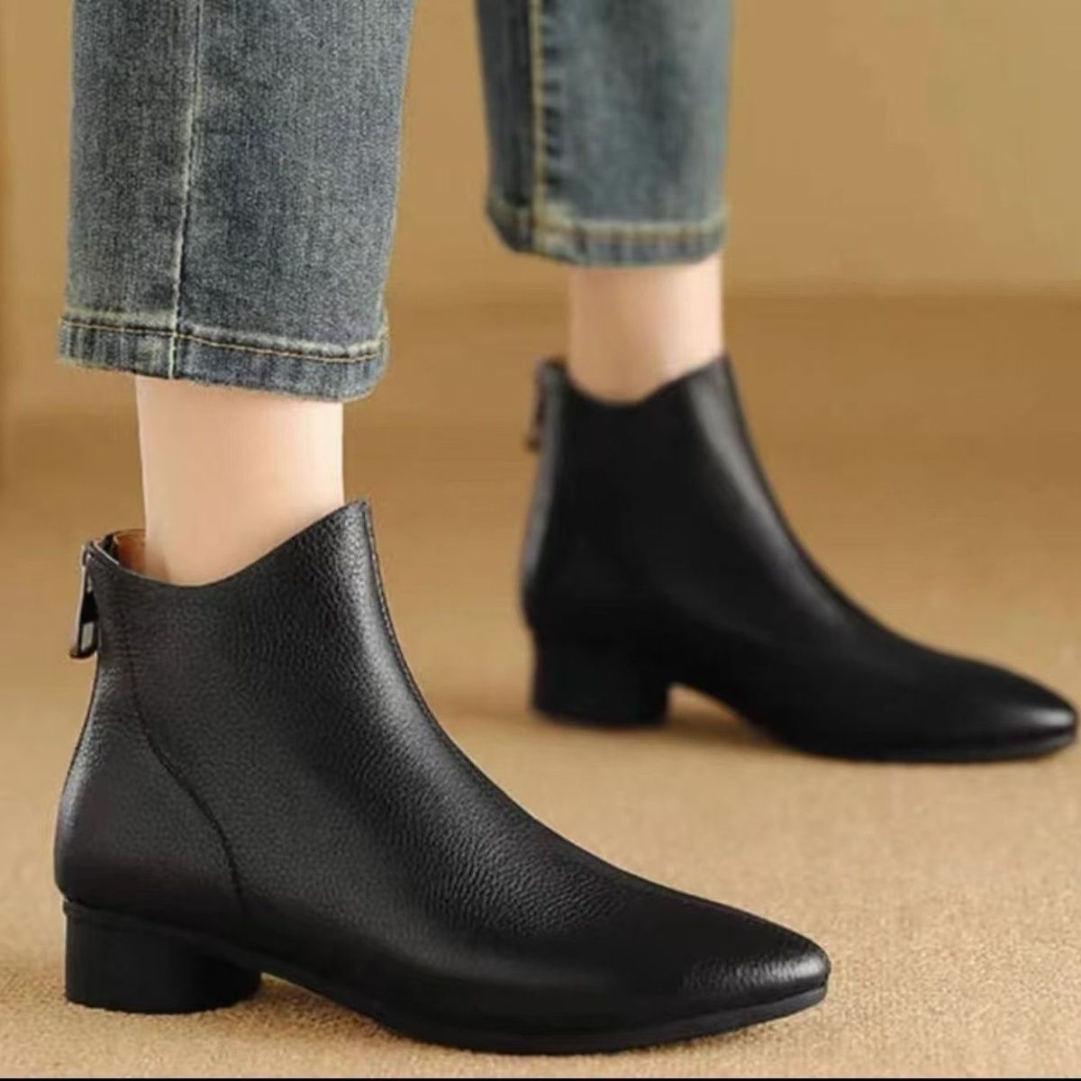软皮粗跟新款秋冬短靴女低跟尖头软底舒适单靴时尚百搭及裸靴鞋子【3月6日发完】